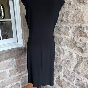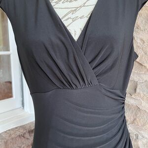 Quite possibly the most versatile, figure & travel friendly dress out there! Selling because I lost weight! Chic black midi dress with a wrap design. Rouching on the bust & side hides many a figure flaw! Perfect for any occasion as it can be dressed up for evening or down for daytime. Small pads in the shoulders that can be easily removed. Smoke & mildew free home.