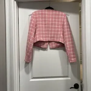 Chic Rachel Zoe cropped blazer in pink and white tweed. Features button closure and elegant design. Never worn. Paper still on buttons on pockets
