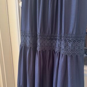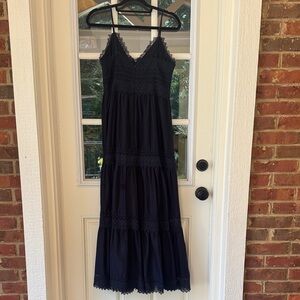 Chic navy maxi dress with lace accents. Features a tiered skirt and delicate straps.