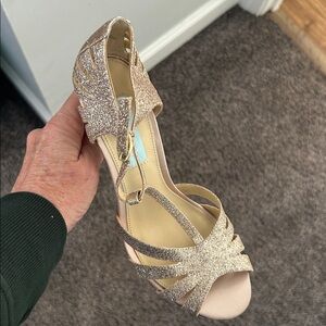 Betsey Johnson Sparkly Champagne light rose Gold T-Strap Dressy Strappy Heel Pump, sz 6.5 Betsey Johnson Betsey Johnson Sparkly Gold T-Strap Dress Pump, sz 6.5 in excellent used condition. These are virtually new with the exception of Very light wear to the sole (they were worn once for an event). Shimmer with these sparkly t-strap dress pump featuring cutouts at counter and toe strap PRODUCT DETAILS Fabric Type 100% Textile/PU Origin Imported Sole Material Manmade Approx 4" Heel CATEGORY Women Shoes Heels
