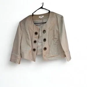Elegant beige cropped jacket with statement buttons. Ideal for chic layering.