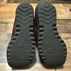 Excellent condition! Beautiful burgundy patent upper. A few slight marks at heel, shown in photos, barely noticeable.