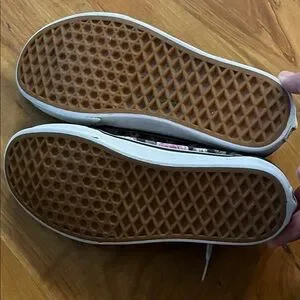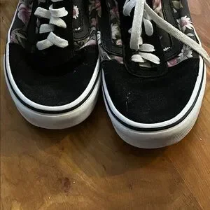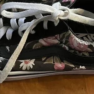 Vans shoes with a floral design. Black base with pink flowers. White laces for contrast.