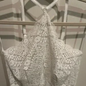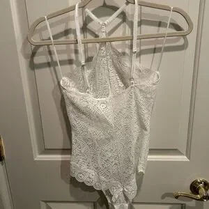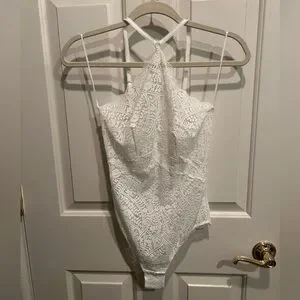 Chic ivory lace bodysuit. Purchased recently and NEVER WORN. Features intricate patterns. Unlined, perfect for layering.