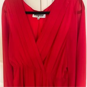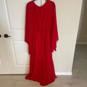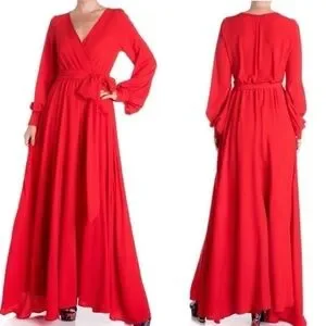 Partially lined for comfort, this maxi dress showcases a V-neckline with a cross-front design, long bell sleeves with button cuffs, an elasticized waist with a side belt and a flowing skirt.
