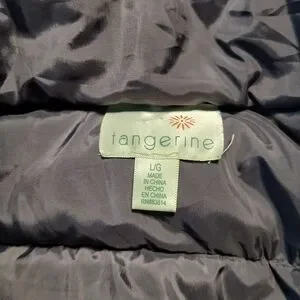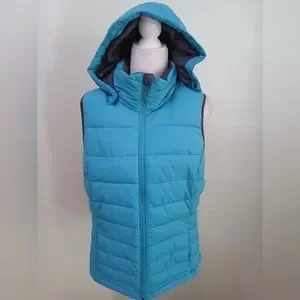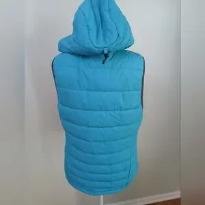 Nylon polyester blend puffer vest, zip front, zip off hood, 2 hidden front exterior zip pockets, pretty turquoise color with charcoal gray interior. EUC.Smoke free pet free home.