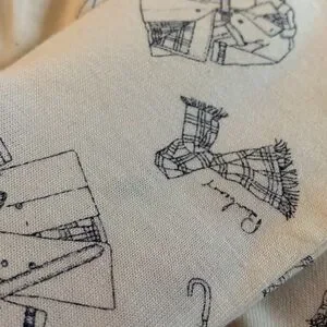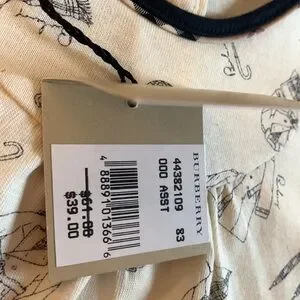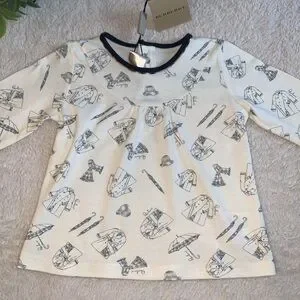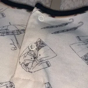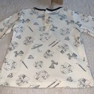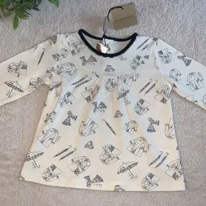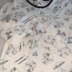 Cute, cream colored top with raincoat and umbrella print pattern. Signature Burberry piping around neckline.