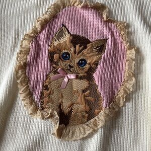 Cozy cream sweater with a cute cat design. Features a pink background and ruffle details.