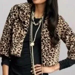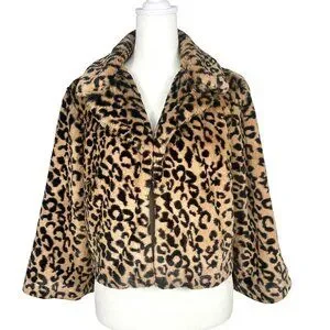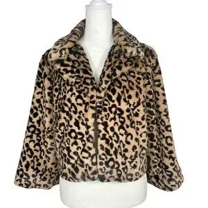 Make a statement in this cropped leopard print jacket of faux fur from CAbi. Full inner lining. Split coller. Wide 3/4 length sleeves. Open front. Super soft! Perfect for a festival, date night, or club night!