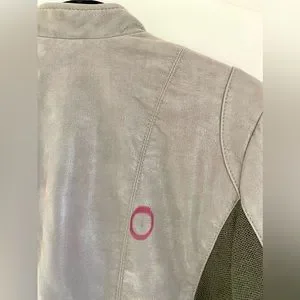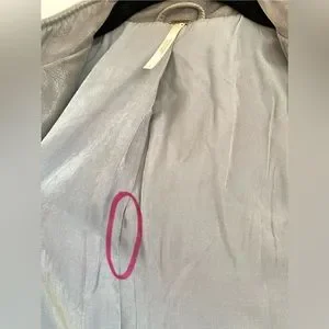 •No stains. There is a scuff near the right shoulder blade, 1 pull on the left arm knit panel, some pilling on the panels (like shown in photo 9), and the inside back seam is pulling slightly, as pictured.
