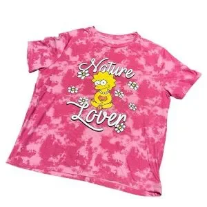 Step into fun, retro vibes with this pink tie-dye graphic T-shirt featuring Lisa Simpson surrounded by daisies and the words “Nature Lover.” Perfect for fans of The Simpsons, this top combines cartoon nostalgia with a playful, kidcore aesthetic. The soft cotton blend makes it ideal for casual everyday wear, summer outings, or as a quirky piece for fans of pop culture and vintage-inspired fashion.