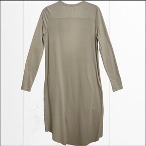 Stylish long tan cardigan with button-up front and pockets. Ribbed texture. Perfect for layering.