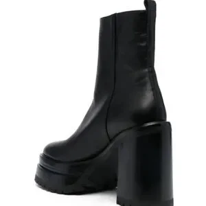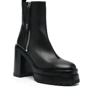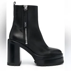 Elevate your footwear collection with AGL's black ankle boots, featuring a sleek design and a substantial platform for added height. Crafted from smooth leather, these boots boast a thick block heel and a convenient inner zipper for easy wear. The rounded toe adds a touch of softness to the modern silhouette, making them a versatile choice for any occasion.