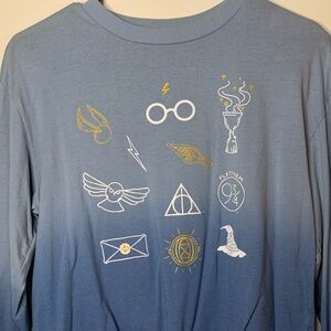 Blue ombré Harry Potter icons long sleeve crop top shirt with tie front