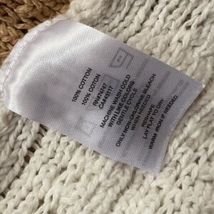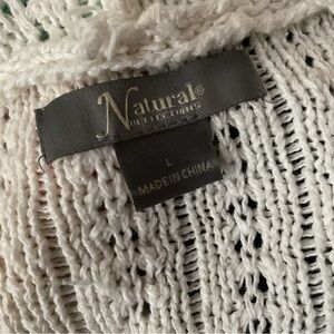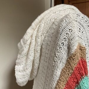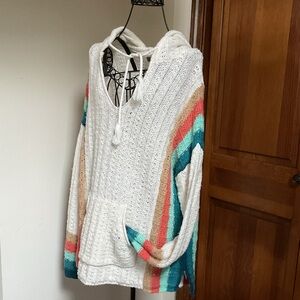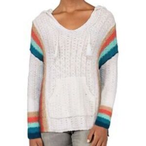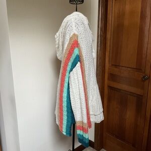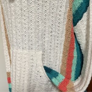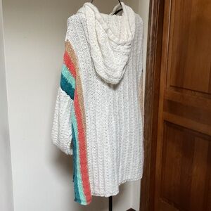 White knit hoodie with vibrant stripes. Features a front pocket and drawstring hood. Perfect for casual wear.