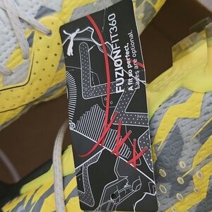Vibrant Puma cleats with a striking yellow and gray design. Ideal for soccer enthusiasts.