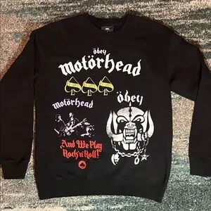 Bold Motörhead graphics on a black Obey crewneck. Perfect for music enthusiasts. Sturdy on the outside yet soft on the inside. Exceptional Used Condition. Grunge, Alt, 80s Sweatshirt