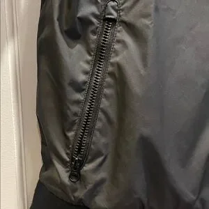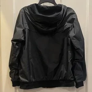 Sleek black windbreaker by Nike. Features a hood and front zipper. Lightweight and stylish. In good used condition. No rips or stains. Some stretching of waste band and pilling at sleeves and waistband. See photos