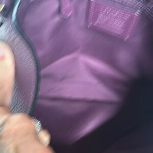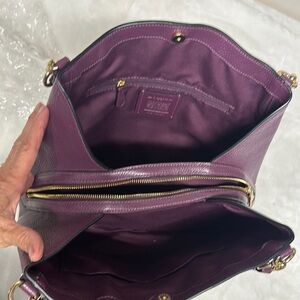 This Coach shoulder bag in a striking purple hue is crafted from premium leather, featuring a pebbled texture and a slouchy silhouette. The single shoulder strap and gold-tone hardware add a touch of elegance, making it a versatile accessory for any occasion. See all photos as they are part of description