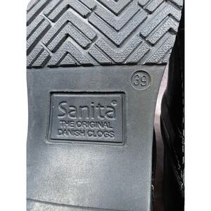 Keywords: Sanita, clogs, danish clogs, black clogs, leather clogs, womens shoes, size 39, crackle leather, slip on shoes, comfort shoes, casual shoes, comfortable clogs, designer clogs, slip resistant shoes