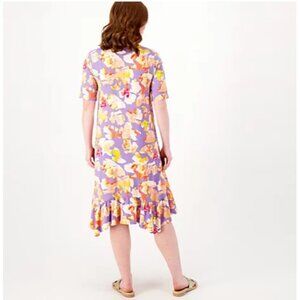 LOGO by Lori Goldstein Women Dress Rayon 230 Elbow Sleeve Black S A606868 Size: S (Small) Color: Black New without tags Fabrication: Rayon 230 knit jersey Features: V-neck, short sleeves, on-seam pockets, ruffle detail at bottom hem Fit: semi-fitted; follows the lines of the body with added wearing ease Length: missy length 41-1/2" to 43-5/8"; plus length 44" to 47-1/2" Content: 90% rayon/10% spandex Care: machine wash, tumble dry