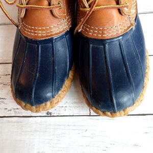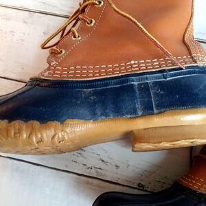 Vintage Bean duck boots, size 7. Blue and tan. These are in good condition but do have some marring on the sides. I've included a picture and it's indicative of all sides. No structural issues at all. Shaft is 6" tall when measured from top of rubber sole. Outsole measures approximately 10"