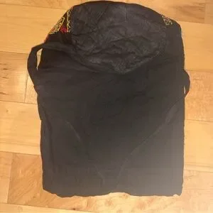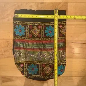 Vibrant bohemian skirt with intricate embroidery. Features blue, red, and green floral patterns on a black base.
