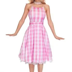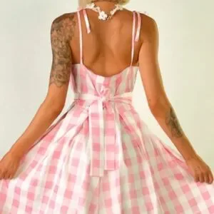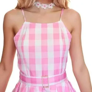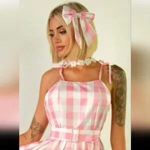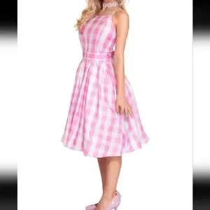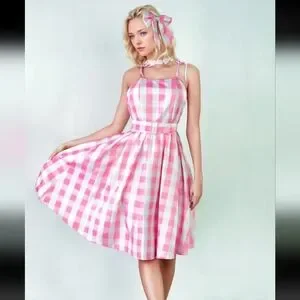 Chic and stylish, this pink checkered sleeveless dress is perfect for any occasion. Enjoy a comfortable fit with its flattering design.--Thank you posh AI.--This is such a cute pink & white gingham fit to flare retro style midi dress with tie shoulder straps & a hidden back zipper. The fabric is a lil on the thin side but isnt see thru other than a possible silhouette when back lit. It's a very lightweight fabric that will really flare out when spinning, but it has absolutely no stretch to it.(Please check the size chart in the photos) I purchased this as a Barbie costume so not only do you get this playful pink dress, you also get the accessories (except shoes) which include the matching large hair bow barette, the white fabric flower necklace & the rhinestone belt buckle on the belt strap. Its interesting how they used this on the models. They slid the buckle onto the center of the belt strap & tied it in the back.🤨Though it might not be super sturdy & and functional, it can also be threaded on one end of the strap & used much like a normal belt. Either way is super cute.😊This dress is tagged a size large & I think it may run just a tiny but large. It could possibly even work for an extra large, but it would be a tighter fit & less comfortable. I typically wear size large in most brands comfortably & i tried this on once & I had extra room, mostly in the bust & upper back area no matter how I adjusted the tie shoulder straps. Cute on its own or throw a petite coat under