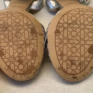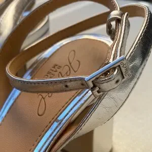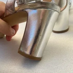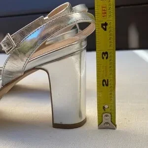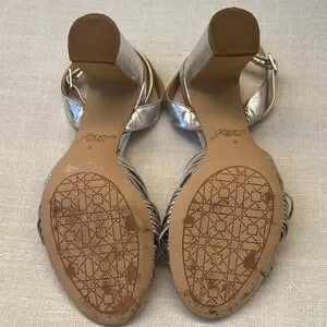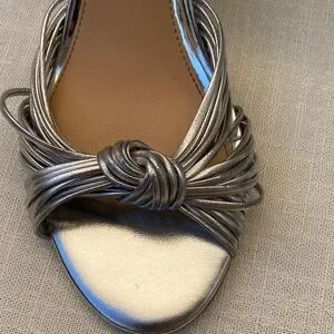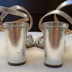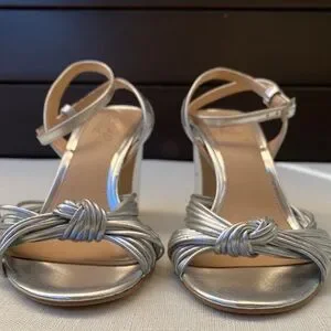 Chic silver block heels with a stylish knotted design. Ideal for elegant occasions. Worn only once. In good used condition, please see pictures for details