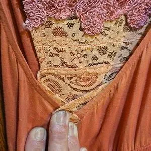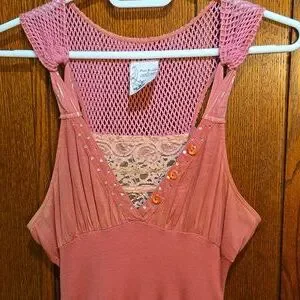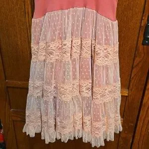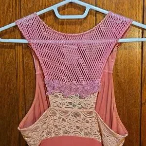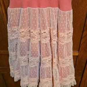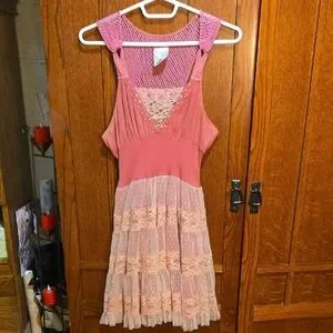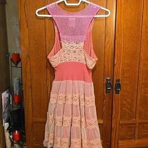 This is an absolutely adorable dress, size small by Free People in good condition. The armpits are stained, which totally ticks me off-nothing in the description when I bought it! It has a racerback, fully lined skirt with polka-dot taffeta, and lace and crocheting on the bodice. It's also trimmed with sequins and non-functioning buttons.