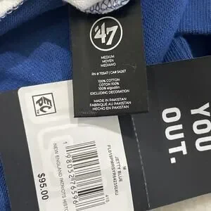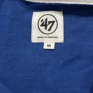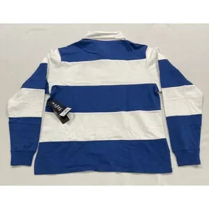 The product is a men's medium long sleeve rugby polo shirt featuring the colors blue and white, officially licensed by the National Football League (NFL) and specifically designed for fans of the New England Patriots. Made by '47, the shirt is a stylish and comfortable option for showing support for the team during the regular season. This high-quality shirt is perfect for any die-hard Patriots fan looking to represent their favorite team in a sporty and fashionable way.