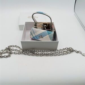 Elegant mini handbag by Vivienne Westwood. Features a vibrant tartan pattern with red, blue, and white hues. Ideal for adding a stylish touch.