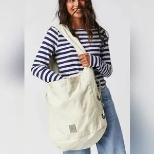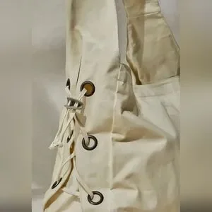 Stylish cream tote bag. Features drawstring details. Perfect for everyday use.