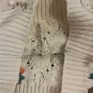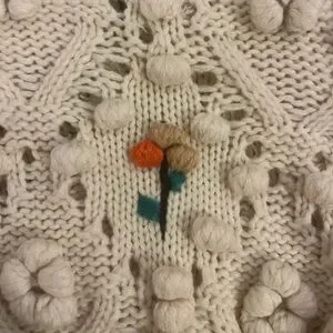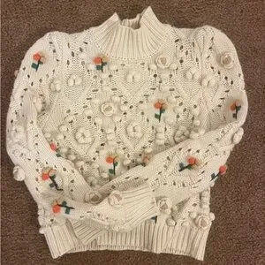 Open knit funnel neck sweater with long sleeves. Floral self appliqué. Ribbed trim. 100% acrylic