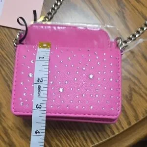 Chic pink mini bag with sparkling silver studs. Features a stylish silver chain strap. Perfect for a glamorous touch.