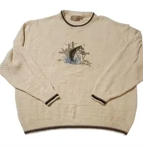 VTG Sweater Mens 4XLT Cream 3D Embroidered Bass Retro Made in USA 4 XL Tall