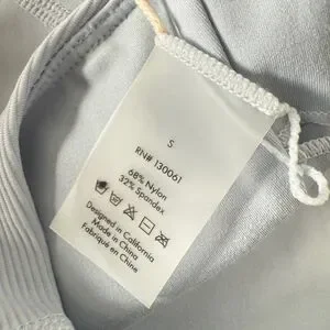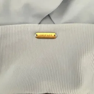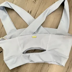 This is a new with tags L*SPACE Active Mercer Bra in size S. The bra is light blue and features a cut-out design. It is made of 68% nylon and 32% spandex. The bra has a ribbed texture and criss-cross straps in the back. The bra has a small gold L*SPACE logo on the back. The original price is $99