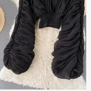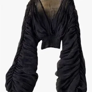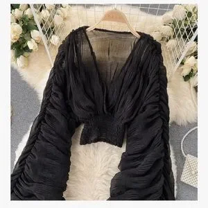 Chic black blouse with ruched detailing. Perfect for any occasion.