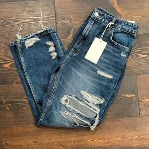 Dark blue denim with stylish distressed detailing. Classic five-pocket design. Perfect for casual wear. Hits at ankle.