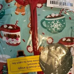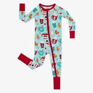Adorable pajamas with holiday-themed prints. Features red cuffs and zipper. Soft and comfortable for bedtime.