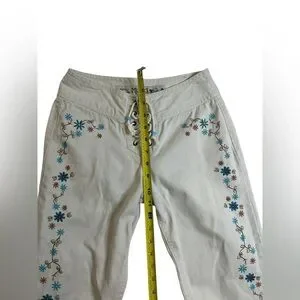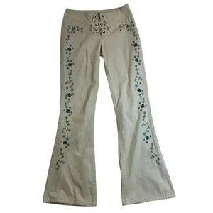 Y2K Revival, Retro Streetwear, Fairy Grunge / Festival Fit, Low-Rise Lace-Up Jeans, Boho Floral Embroidery, y2k mudd jeans, lace-up jeans, vintage mudd denim, fairy grunge pants, embroidered low-rise jeans, boho festival denim, rare mudd jeans size 3, retro streetwear flare jeans, y2k lace-up flare