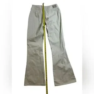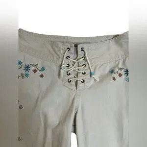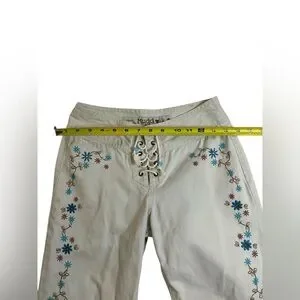 Style: Lace-up front tie waist, low-rise flare cut, embroidered floral accents
