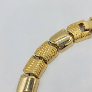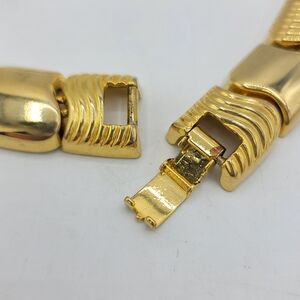 Big, glossy, and unapologetically 1970s. This unsigned gold-tone collar is built from alternating sculpted “wave” links and smooth convex links, finished with an integrated foldover clasp. It sits close to the neck with that Studio-54, disco-glam presence. Think the iconic 70s couture chokers (e.g., Givenchy vibe)