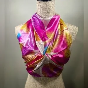 Head scarf; silk like finish and 100% polyester. Can be used as a head scarf or styled as top. Size:90X90cm