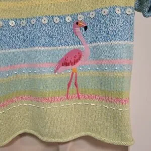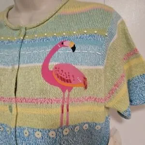 Susan Bristol Size S Short Sleeve Sweater Cardigan Beaded Flamingos 2001 NEW