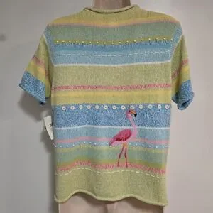 The Susan Bristol Size S Short Sleeve Sweater Cardigan is a vibrant and eye-catching piece perfect for a variety of occasions. Featuring a striped pattern with beaded flamingos, this tight-knit cardigan is made from a blend of ramie and cotton, making it lightweight and breathable. The round neckline and classic fit make it a versatile option for summer, fall, and spring. With its colorful and tropical theme, this vintage piece from 2001 is sure to add a fun and stylish touch to your wardrobe. This is new with tags and originally retailed for $98. All measurements are approximate and includes 22.5 inches from shoulder to hemline and 18 inches armpit to armpit. #10362