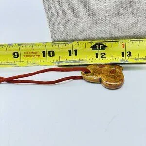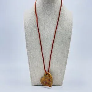 Unique signed SC artisan necklace featuring a polished natural stone heart pendant on a rustic cord. Boho-inspired jewelry piece with earthy tones and handcrafted charm.