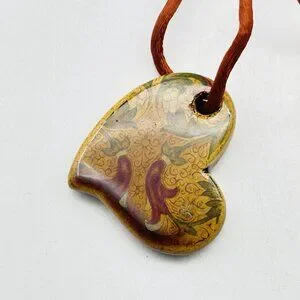 SC Signed Stone Heart Pendant on Brown Cord Floral Transfer Boho Festival Party Hippie