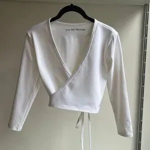 Elegant wrap design. Long sleeves. Soft fabric. Perfect for layering.