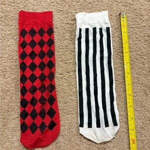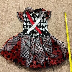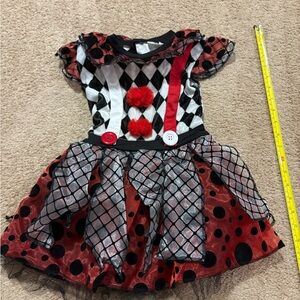 Fun jester clown costume with bold black, white, and red design. Includes playful patterns and accents. Ideal for Halloween and dress-up. This set includes dress, headband with mini hat, and stocking socks. This has only been worn once. It is in great condition with a small stain on front (as shown in pictures). This could easily be removed. Priced accordingly. Make me an offer!!